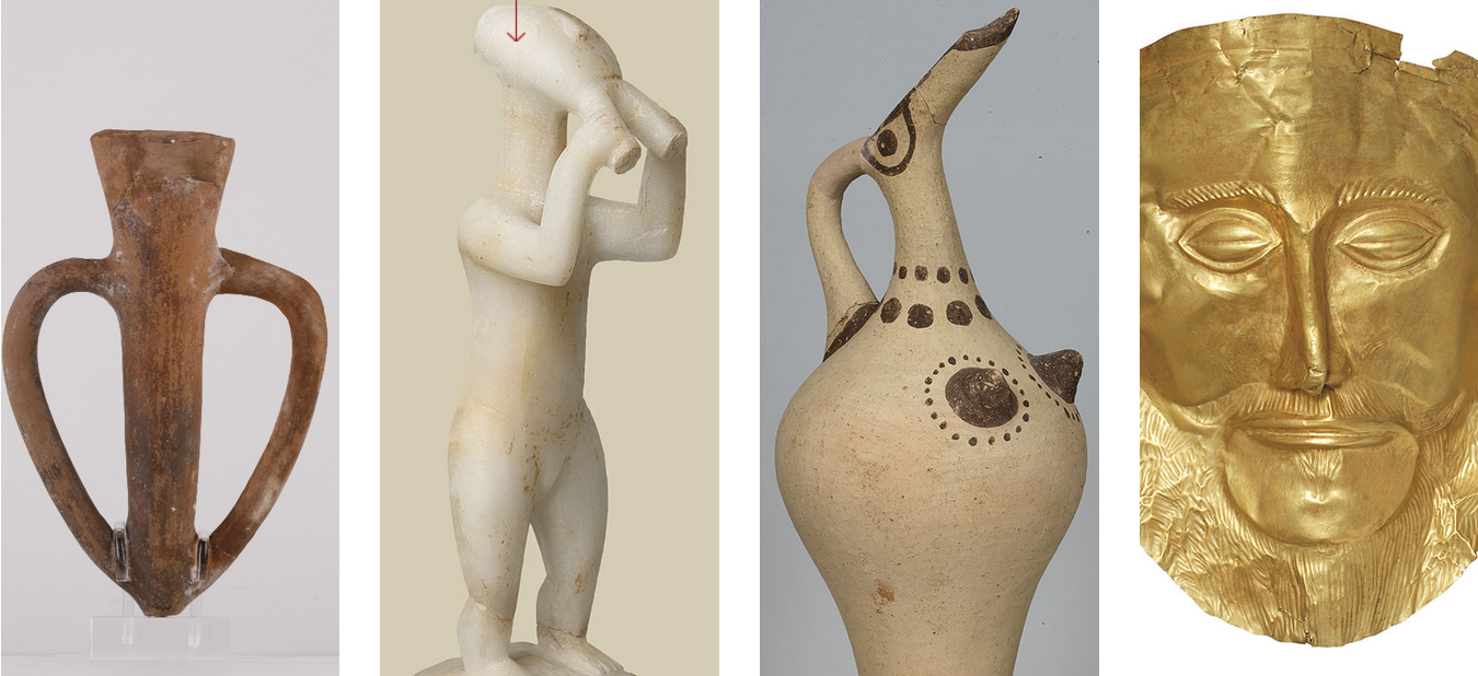 α) στη Συλλογή Προϊστορικών Αρχαιοτήτων, που περιλαμβάνει έργα των μεγάλων πολιτισμών που αναπτύχθηκαν στο Αιγαίο από την 7η χιλιετία έως το 1050 π.Χ. (νεολιθικού, κυκλαδικού και μυκηναϊκού). Τα σημαντικότερα εκθέματα είναι οι θησαυροί των βασιλικών τάφων των Μυκηνών, οι πινακίδες της Γραμμικής Β γραφής, και τα αινιγματικά μαρμάρινα κυκλαδικά ειδώλια.